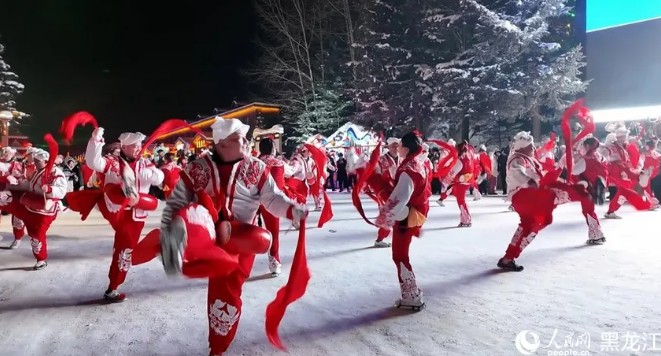 隨著夜幕降臨,一陣激昂而富有節奏感的鼓點響起,來自陜西的安塞腰鼓演員們身著艷麗的陜西傳統民俗服飾,腰系紅鼓,帶著陜北風情,從黃土高原走進童話雪鄉。演員們身姿矯健,用力揮槌踢腿、轉身跳躍,動作整齊劃一,隊形靈活多變,令人目不暇接。火紅的服裝與周圍的雪景形成了鮮明對比,仿佛是冬日里的一抹火焰,吸引著四面八方的游客匯聚而來。